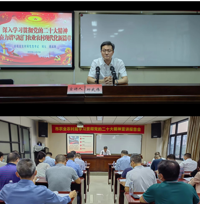 为深入学习宣传贯彻党的二十大精神,切实把党员干部群众的思想统一到党的二十大精神上来,把力量凝聚到党的二十大确定的各项任务上来,11月17日下午,厦门市农业农村局举办党的二十大精神宣讲报告会,局党组书记、局长邱武伟作宣讲报告,局系统中层以上党员领导干部参加,宣讲会由副局长、二级巡视员许心凌主持。